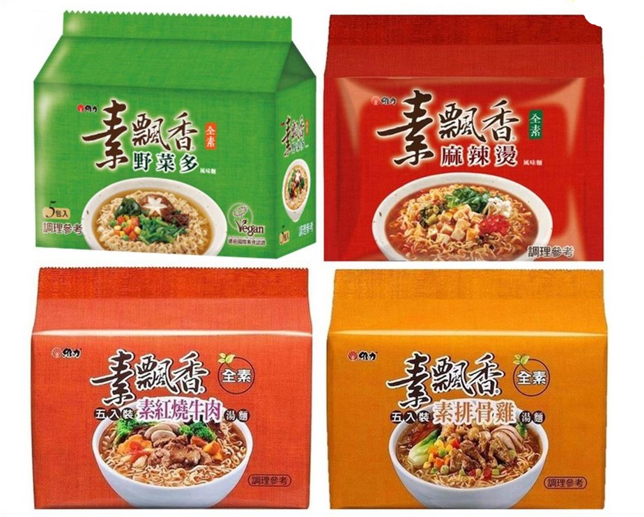 | 口味 | 麻辣燙風味麵, 素紅燒牛肉麵, 素排骨雞湯麵, 香菇野菜, 素麻辣拌麵 |