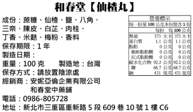- 成份:蔗糖、仙楂、鹽、八角、三奈、陳皮、白芷、肉桂、丁香、米麩、梅粉、香料