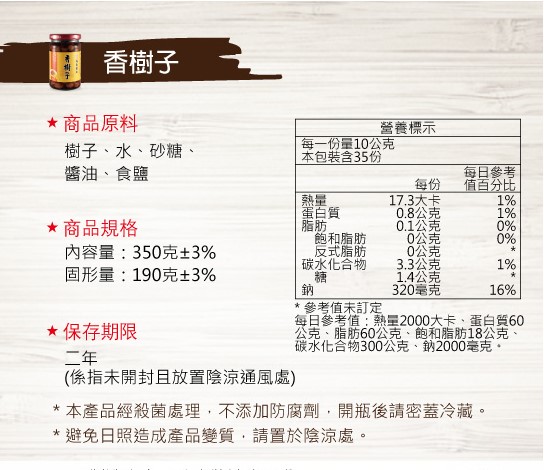 - 原料:樹子、水、砂糖、醬油、食鹽