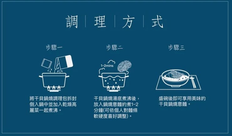 - 內容物:鍋燒意麵、干貝鍋燒調理包、乾燥高麗菜
