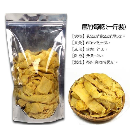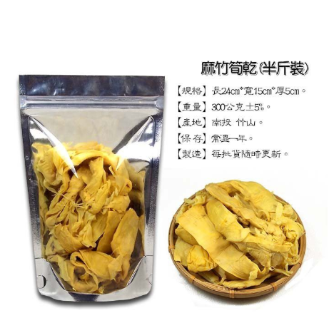- 麻竹筍乾又稱二指筍乾(約二個手指寬),是麻竹筍經殺青→發酵→曝曬而成,約六成乾,製作過程中只加鹽,沒有添加硫磺等化學藥劑,燉滷之前需泡2小時即可。